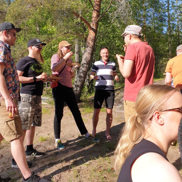 Kesäpäivänä työasioilta ei täysin vältytty, mikä on tietenkin aivan normaalia. Toki olin jutellut kaikkien kanssa jo aiemmin, mutta nyt tuli puhuttua enemmän myös muista kuin työasioista. Positiivisesti yllättävää oli, että lähes kaikki olivat messissä koko illan. Ja vaikka meitä olikin monta, porukka pysyi kasassa ja viihtyi yhdessä myös retken jälkeen. “